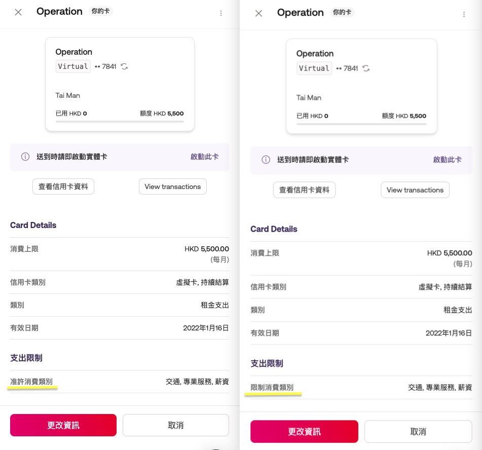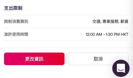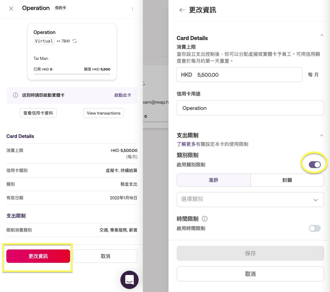 第 4 步:在為Reap Card 設置類別限制後,該卡的詳細資料頁面上會顯示你早前選用了的限制。如須更新卡的類別限制,點擊更改資訊後即可到相應欄目更新。