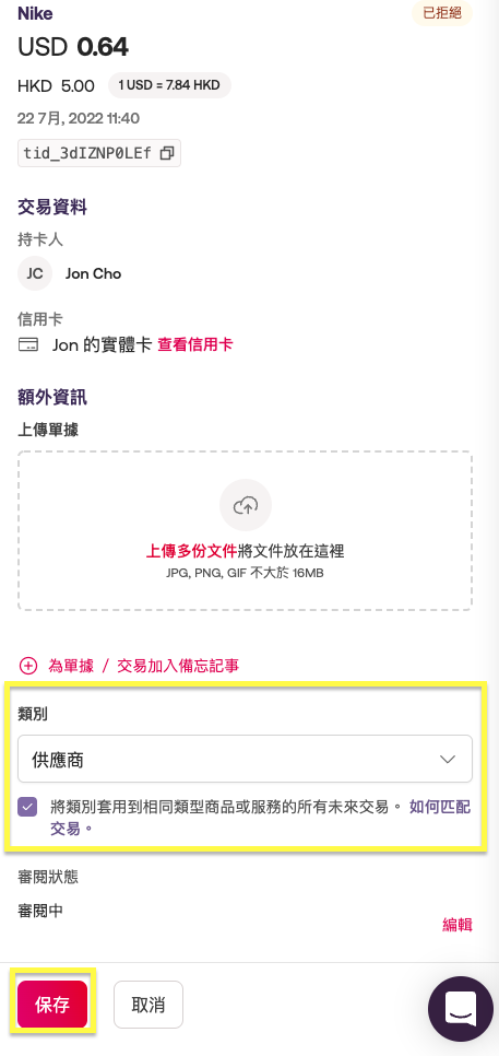 如果你想進一步自訂消費類別,你可以修改商戶的分類。例如,在 Nike(耐克)商店內的消費在一般情況下通常會被歸類為「餐飲及消遣」,但對一間體育用品店來說,這消費可能應該被分類為「供應商」。