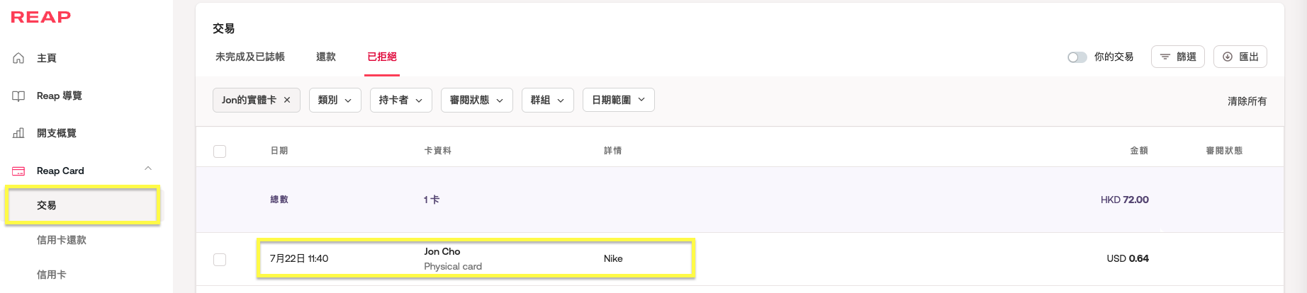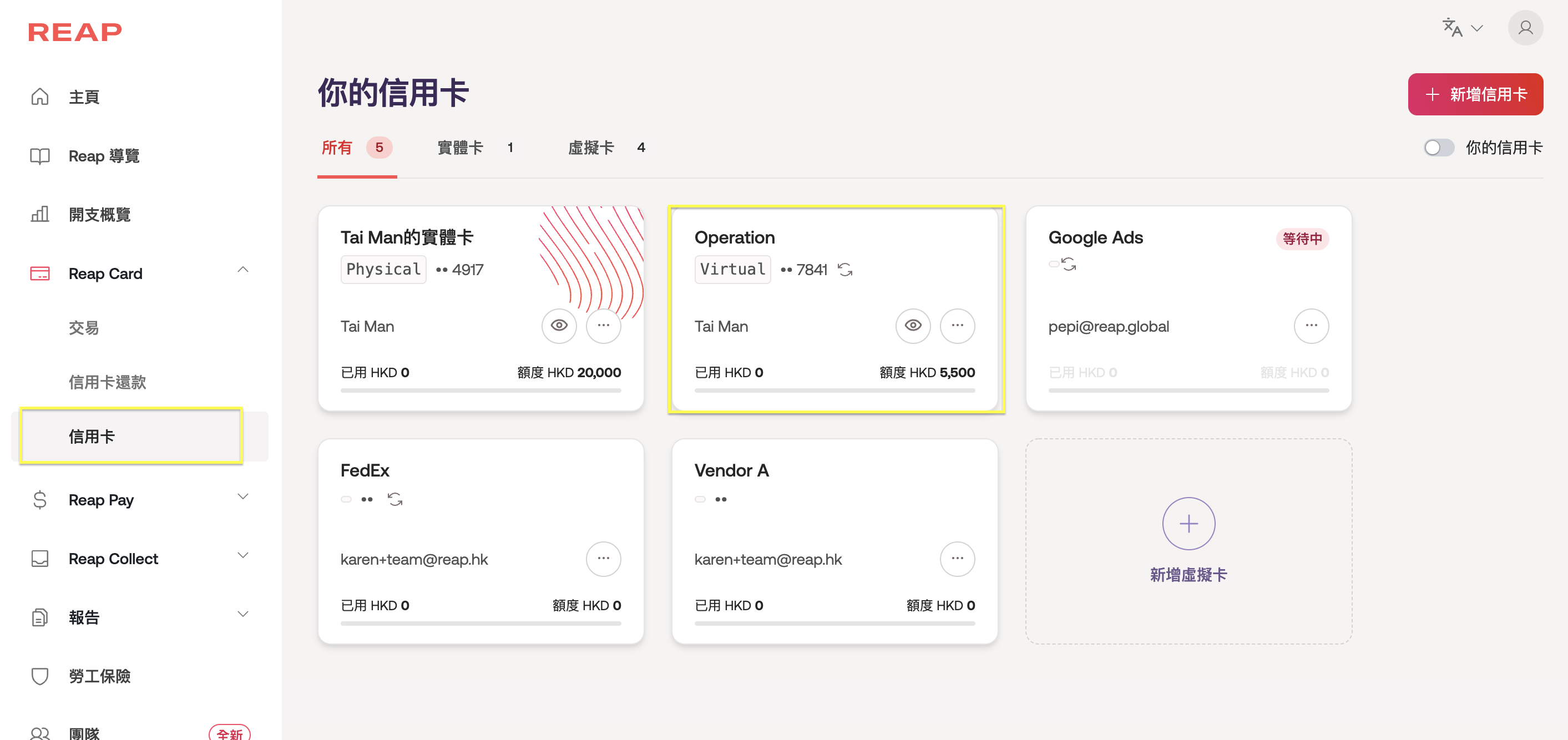 第 1 步:要預先准許或封鎖某些類型的 Reap Card 簽賬,你可以登入 Reap 賬戶後選取信用卡頁面,並點選你要設置支出控制的卡。