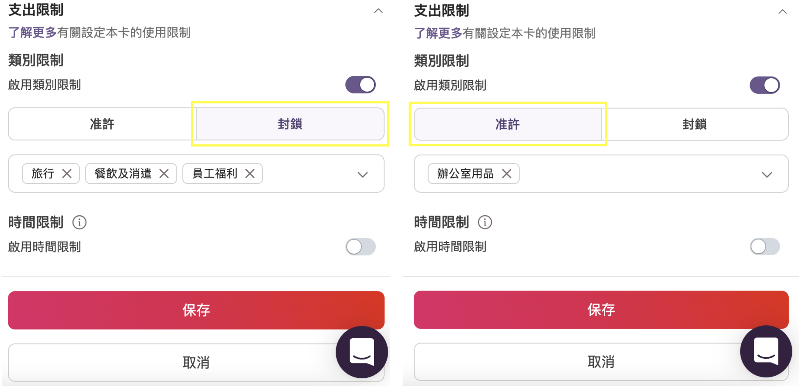第 3 步:你可以准許或封鎖一個或多個支出類別。選好後,點選保存以確認更改。