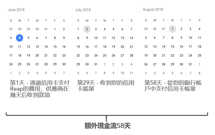例如:信用卡於每月2號為截數日,1號為還款日,你在6月4日用信用卡簽帳$500, 咁依筆$500會7月2日截數日才出現在你的月結單上,而當你收到月結單後,你的最後還款期是8月1日。 如果在這個情況, 由你簽賬到你還款的日期就有58日的免息還款期 (6月4日-8月1日)。