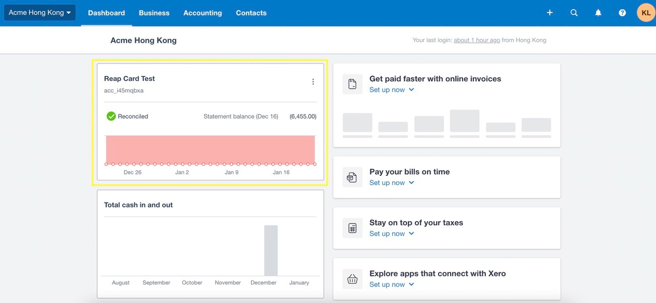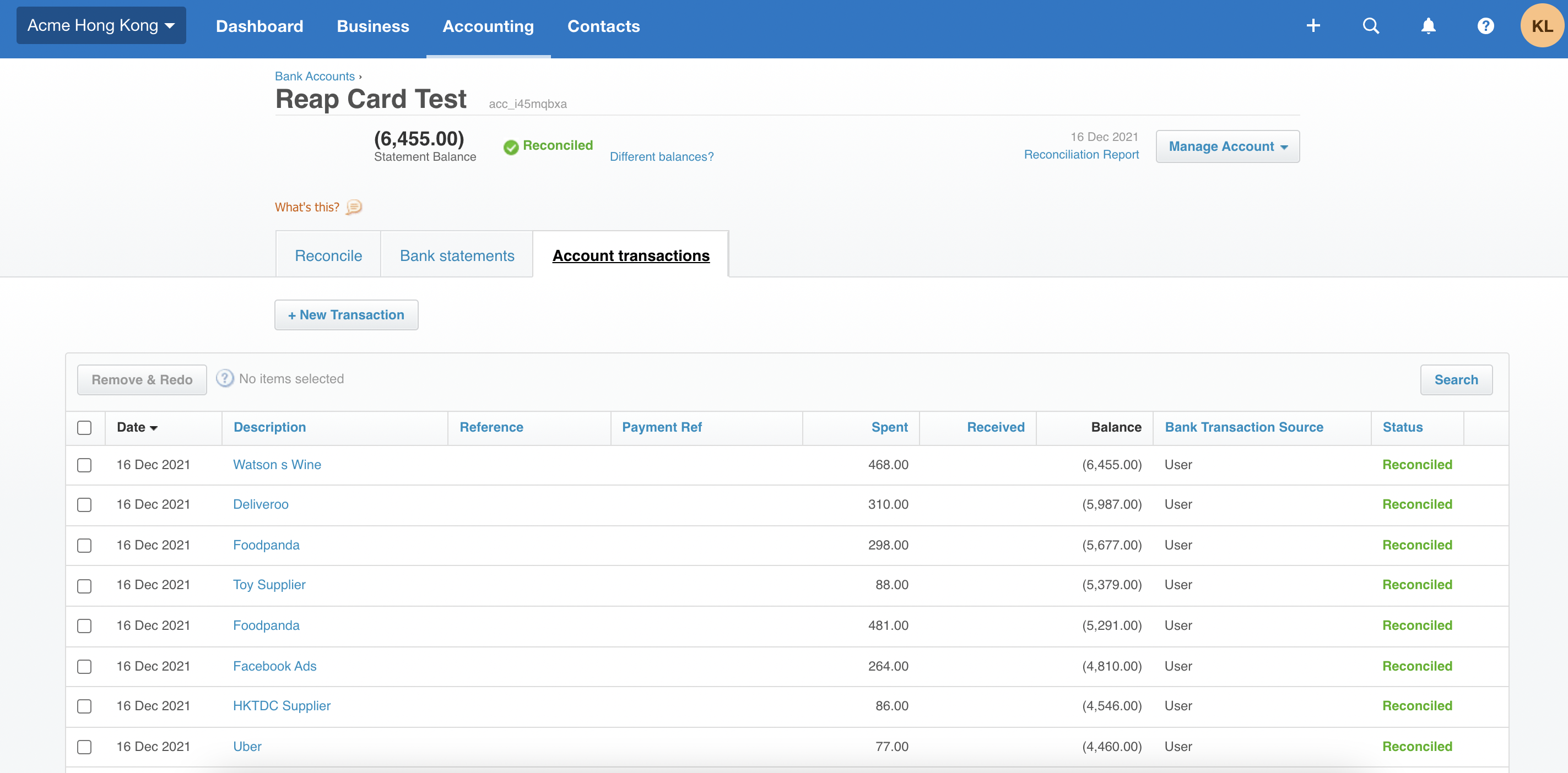同步完成後,在你的會計軟件帳戶之Reap Card的頁面中,點進Reap Card 開支分析的部份(圖中黃色標示)。你從Reap帳戶同步到會計軟件的交易,將會顯示在 Account transactions 分頁。