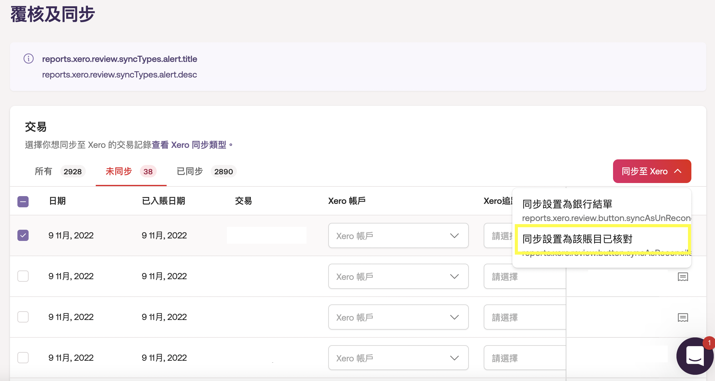 更改交易類別後,你可以剔選需要同步的交易,或者全選所有交易,然後按同步至會計軟件。